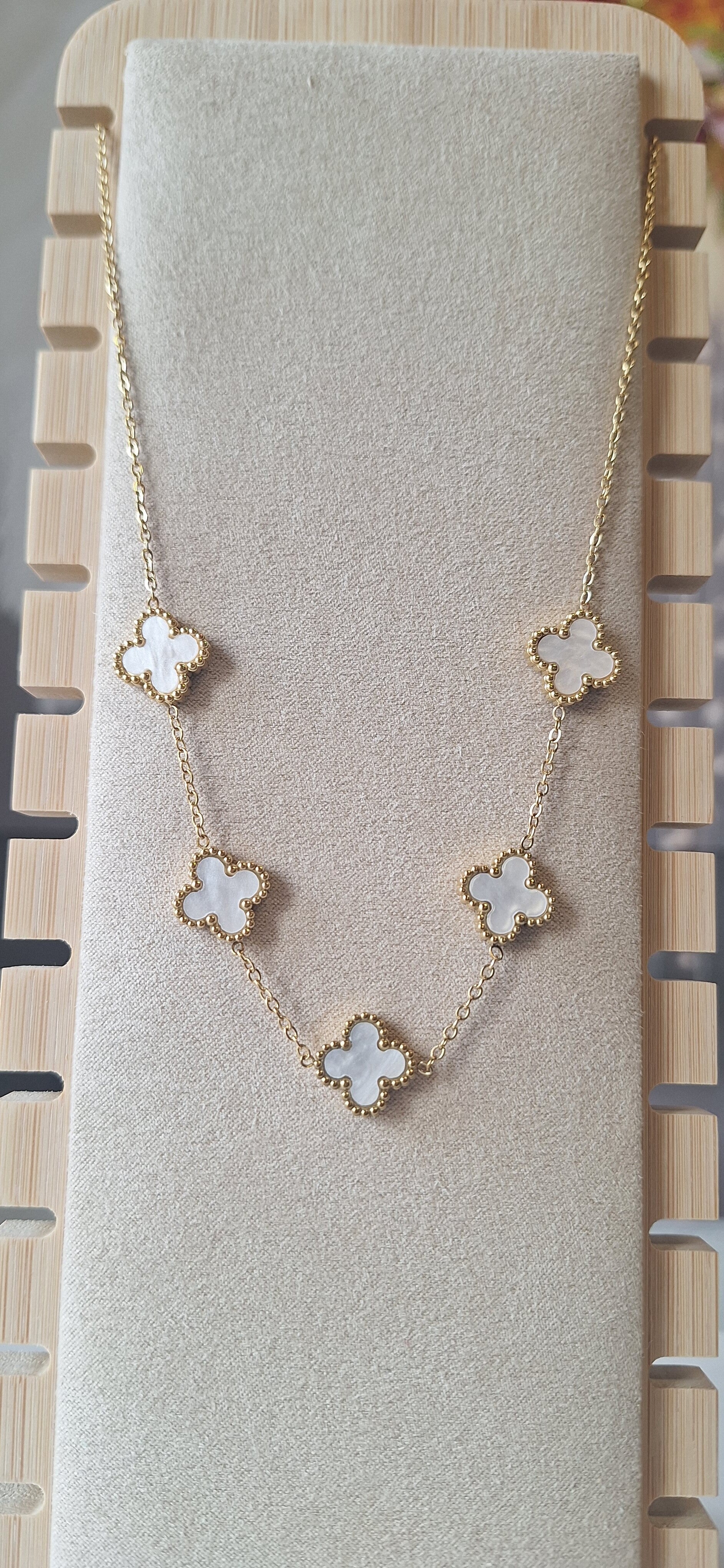 Collier Quatre Trèfles DoréPendentif en forme de quatre trèfles, symbole de chance, en finition dorée.Fabriqué en acier inoxydable, élégant et durable.