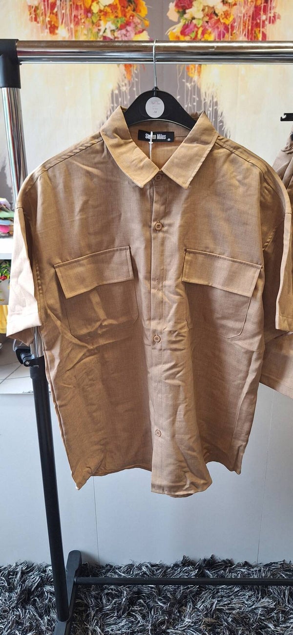 Style décontracté et pratique avec une chemise camel à deux poches et un short à lacets équipé de deux poches classiques.
